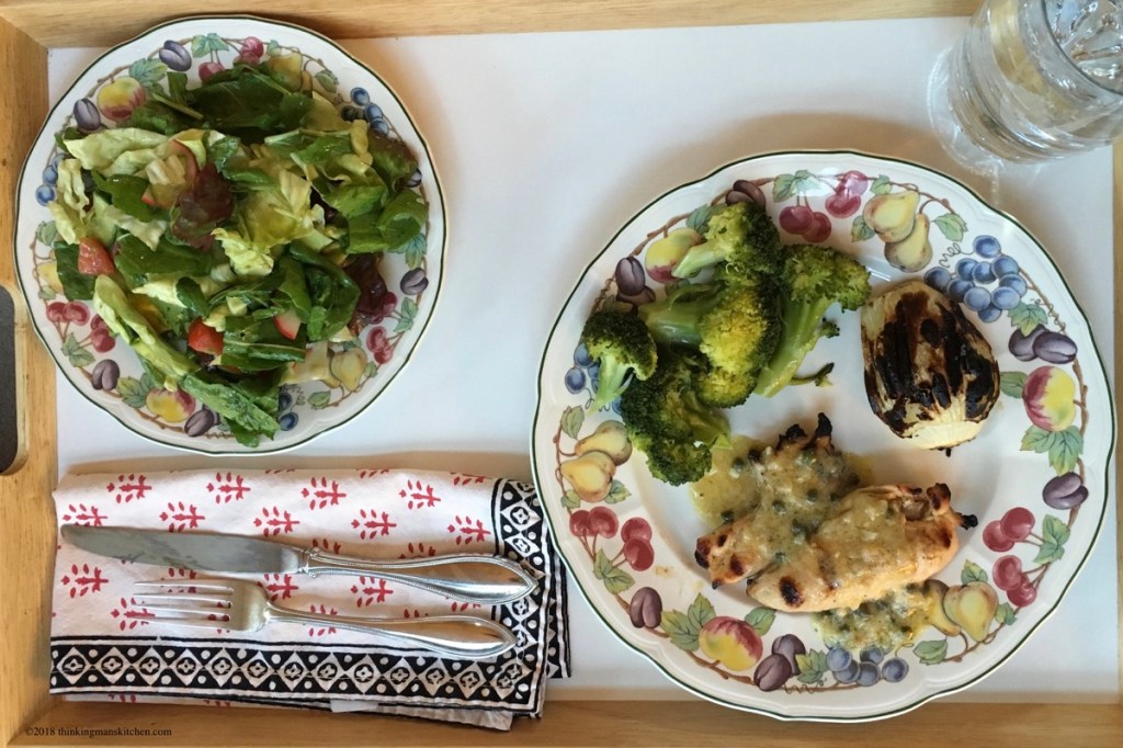 Dinner on Tuesday: Grilled lemon chicken with lemon-caper sauce, grilled onion, steamed broccoli, and our usual salad. This chicken preparation is one of my wife’s absolute favorites. I make it often – at least once every two weeks or so.