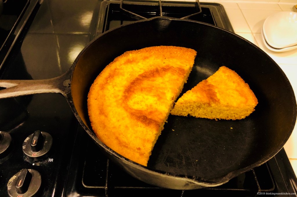 This is a no wheat flour recipe. It is crumbly and a little crunchy rather than springy and custardy like some cornbreads made with a combination of corn and wheat. Easy to make, it is buttery tasting and perfect with a steaming bowl of chili on a cool evening.